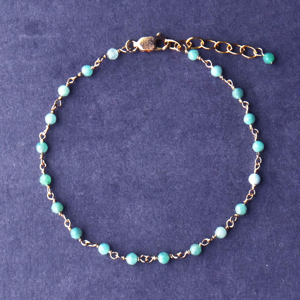5月の誕生石エメラルドのグリーンが爽やかなブレスレット。エメラルドグリーンが綺麗な石は他の石にはない色味で人気が高い石です。全長17cmと18cmの2種類があり、3cmのアジャスターがついているので長さ調節ができます。金具部分はK14gf(ゴールドフィルド)なので落ち着いた色味で綺麗です。アジャスター部分にも一粒のエメラルドがキラリ。