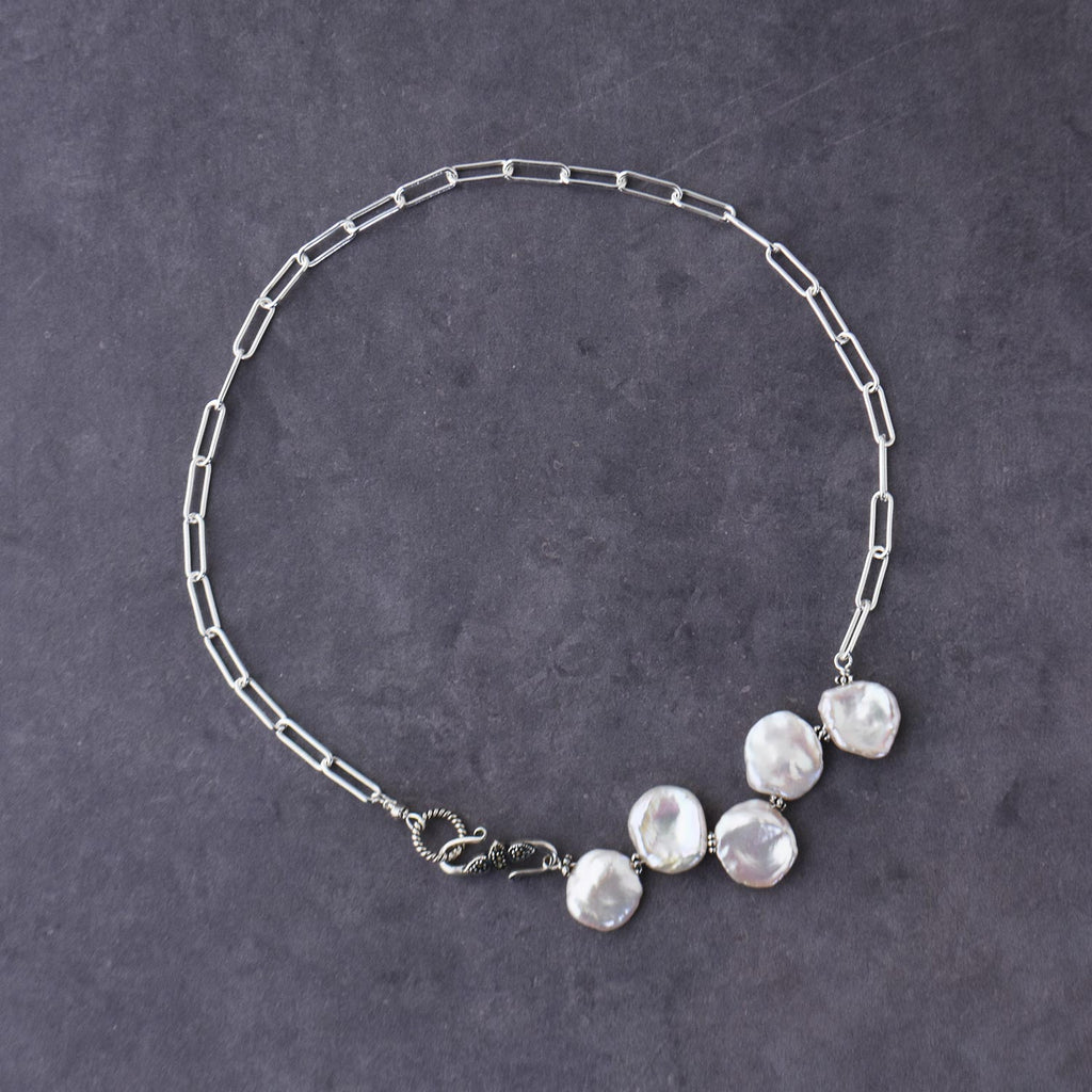 太めのシルバーチェーンに、花びらのようなケシパールを組み合わせた、存在感のあるネックレスが登場しました。